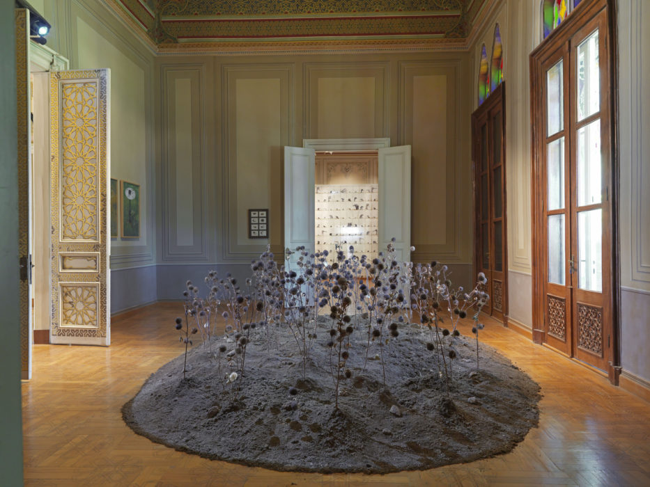 Bir başka odada, Fatoş İrwen’in Zaman Hasadı işine rastlıyorsunuz. Toprak serilmiş zemine, Diyarbakır’dan getirilmiş pamuk sapları yerleştirilmiş. İçeri adım atar atmaz havada asılı duran kokuyu hissediyorsunuz; hem bereketli toprakların hem de kayıpların kokusu. İrwen’in işinde kişisel hafıza ile kolektif belleğin iç içe geçişini görüyorsunuz. Köşkün ağır duvarlarının içinde Mezopotamya’nın güneşi, gölgeler ve mücadele dolu bir manzara beliriyor.