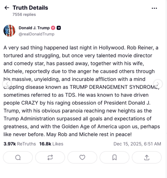 Öte yandan olay, ABD’de politik bir tartışmanın da parçası hâline geldi. ABD Başkanı Donald Trump’ın, Reiner’ın geçmişteki siyasi duruşuna gönderme yapan paylaşımı kamuoyunda tepki topladı; yorumun “zamansız ve saygısız” olduğu yönünde eleştiriler geldi. Tartışma kısa sürede sinema çevrelerinin dışına taşarak sosyal medyada geniş bir karşılık buldu.